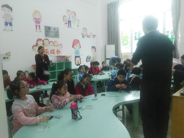 这一期活动内容是制作“会说话的枪靶”。课堂上,老师充分调动同学们的兴趣和积极性,只做了简单的辅导,同学们就可以根据自己的意愿组装一个属于自己的枪靶玩具,玩具小枪打中靶后还会发出小朋友们自己录制好的声音,引起了同学们的好奇。