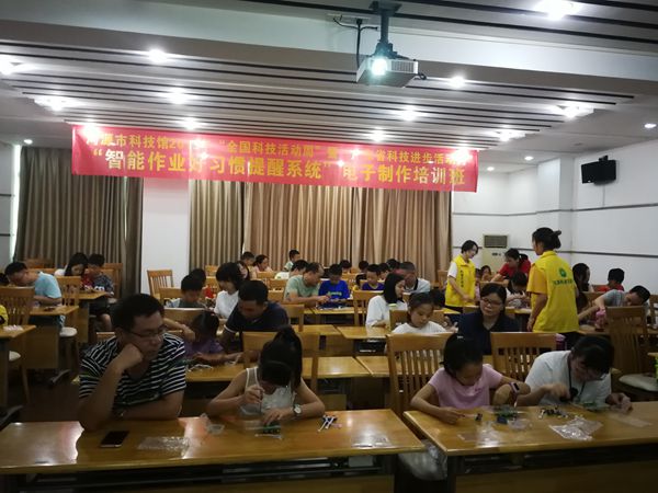 5月25日,在“广东省科技进步月”活动期间,我馆举办了“智能作业好习惯提醒系统” 亲子电子制作培训课,受到30组家庭热捧,共60多人在课堂上齐动手参与制作。