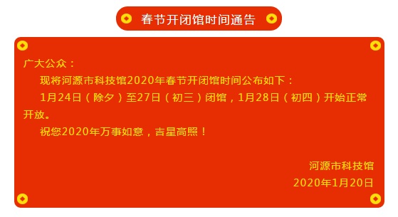当前位置:首页 动态资讯 馆内动态 河源市科技馆春节开闭馆时间通告 来源:河源市科技馆 发布日期:2020-1-20 阅读次数: 字号:[大] [中] [小] 上一篇:我馆召开2019年度工作总结会议 下一篇:我为群众办实事—科普活动走进源城区老城公园