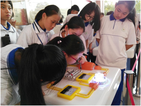 我馆带去的项目除了有车载展品、益智玩具、机器人表演,还有“意外伤害的急救方法”、“夏日常见病毒的防治”、“怎么样预防肥胖”等科学知识的展板宣传,吸引了2200多名师生前来参观体验。