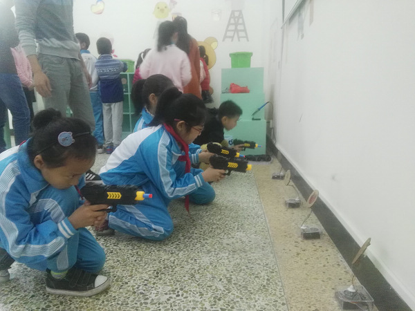 这一期活动内容是制作“会说话的枪靶”。课堂上,老师充分调动同学们的兴趣和积极性,只做了简单的辅导,同学们就可以根据自己的意愿组装一个属于自己的枪靶玩具,玩具小枪打中靶后还会发出小朋友们自己录制好的声音,引起了同学们的好奇。