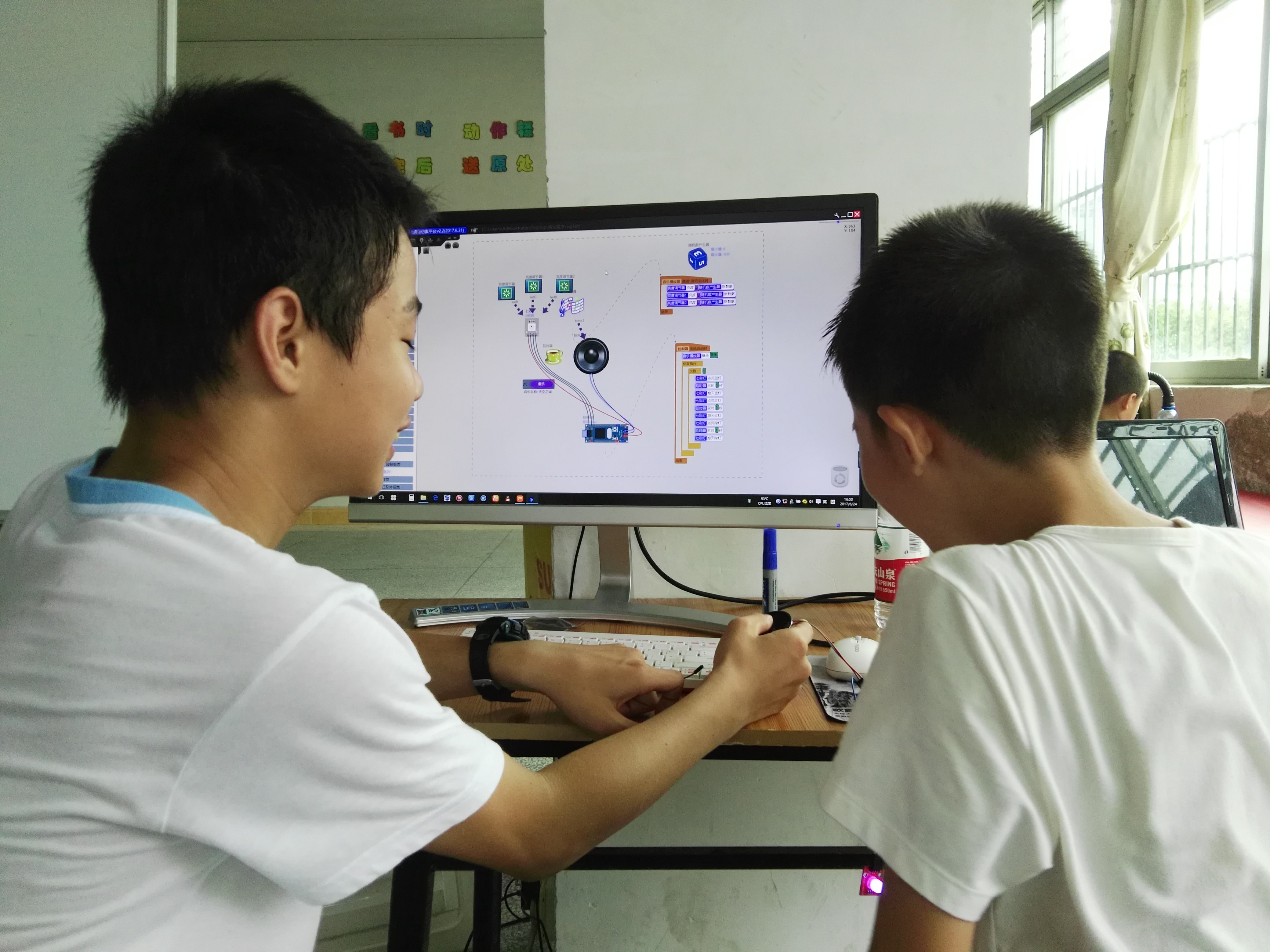 本次课程以电脑为载体,同学们通过学习电脑编程,实现将三色灯变成七色彩灯,并通过编程让枯燥的“嘀嘀”声形成美妙的音乐播放出来,再把编程好的灯光和声音导入实物作品中,搭建独特的七彩音乐小屋。