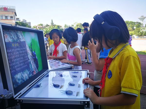 活动中,科普志愿者向同学们展示了有趣的科普展品,丰富的昆虫展、好玩的益智积木、生动的机器人表演和3D电影,并和师生展开交流互动,让同学们更直观深入地了解科普知识。