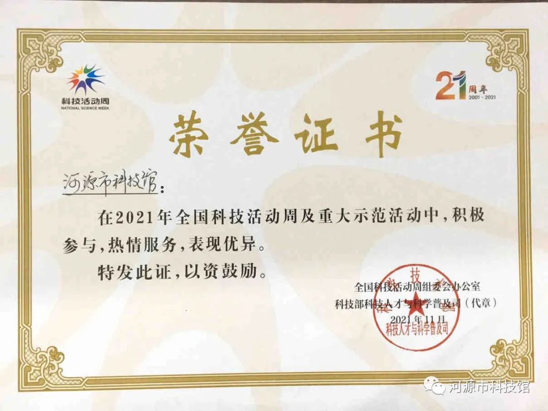 全国科技活动周组委会办公室、科技部科技人才与科学普及司颁发荣誉证书,表彰在2021年全国科技活动周及重大示范活动中积极参与、热情服务、表现优异的单位。我馆获表彰。
